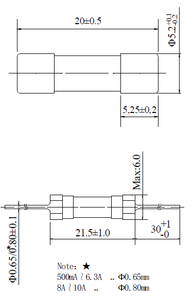 | 0500 | 500mA | 250V AC | 1800 | 2.5 | 0.152 | 1500A@250V AC 10kA@125V AC 50-60Hz Cosφ=0.7-0.8 |